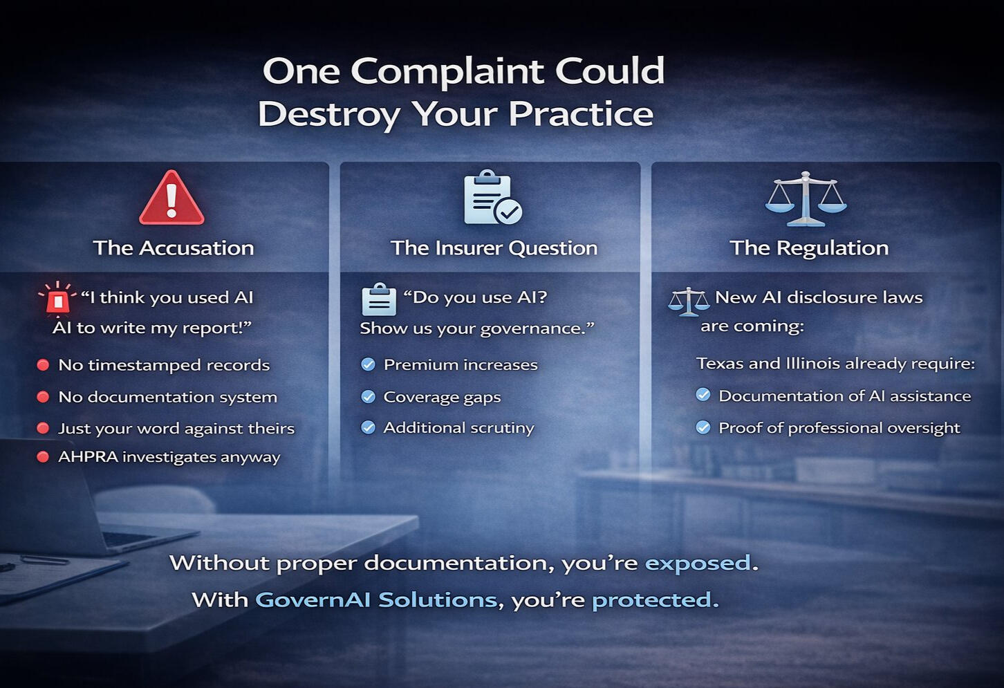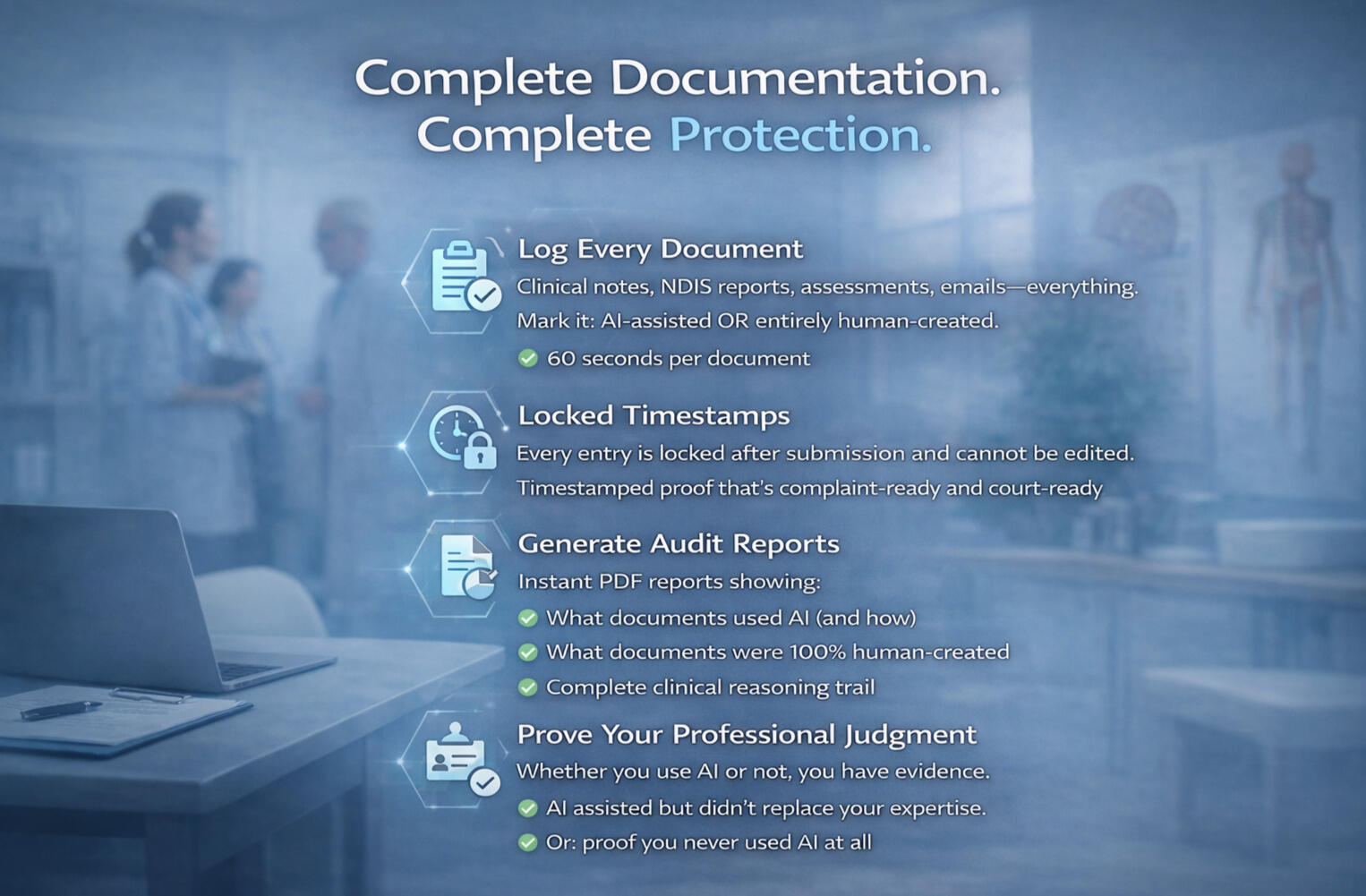 Log every document. Prove what's AI-assisted and what's not. Stay protected from complaints, insurers, and regulatory investigations.